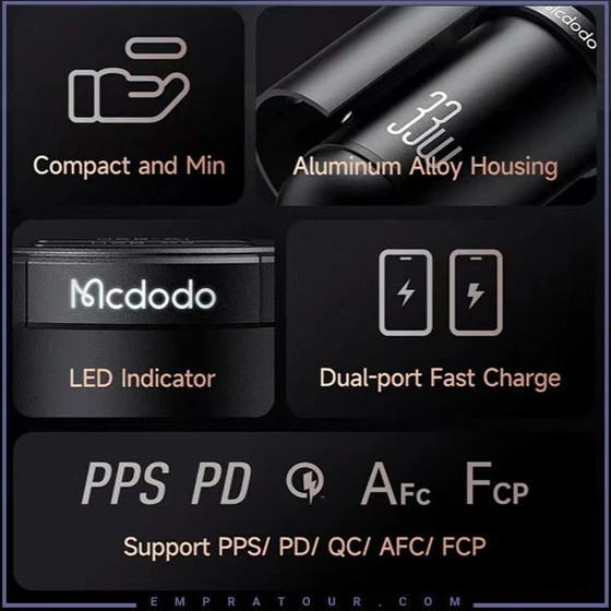 با توجه به این ویژگی ها ، شارژر فندکی 2 پورت 33 وات مک دودو PD33W 1C1U LED Fast Car Charger CC-232 یک انتخاب